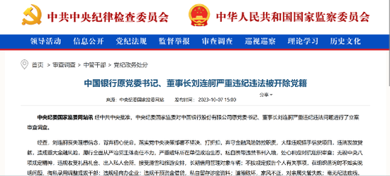 2023年10月7日,经中共中央批准,中央纪委国家监委对中国银行股份有限公司原党委书记、董事长刘连舸严重违纪违法问题进行了立案审查调查。